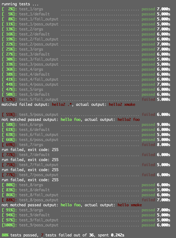In the new version, we have also added a built-in test command: xmake test. We only need to configure some test cases through add_tests on the target that needs to be tested to automatically execute the test.